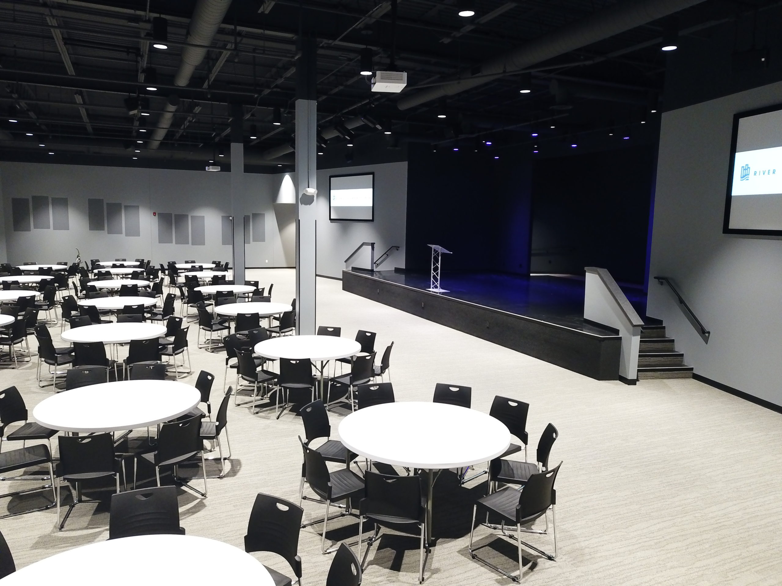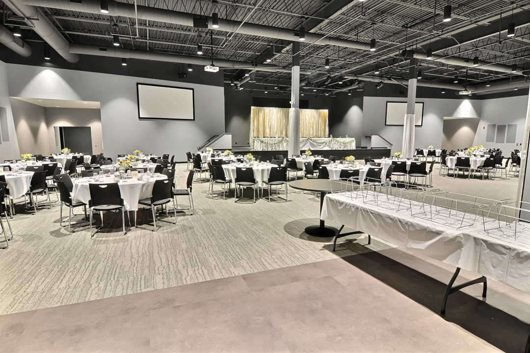 Multi-purpose auditorium space for weddings, large meetings, conferences, receptions, and banquets. Total space is 5,700 square feet, with a max capacity of 550 for theater-style seating and 330 for table seating.